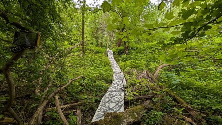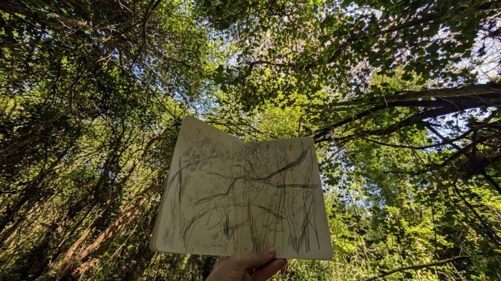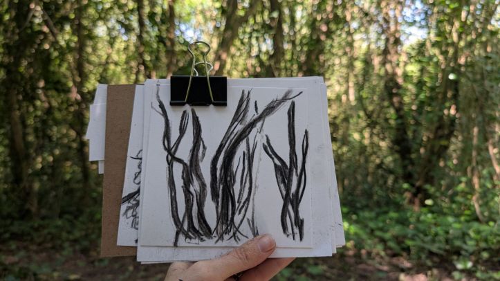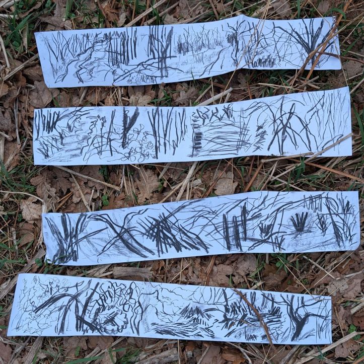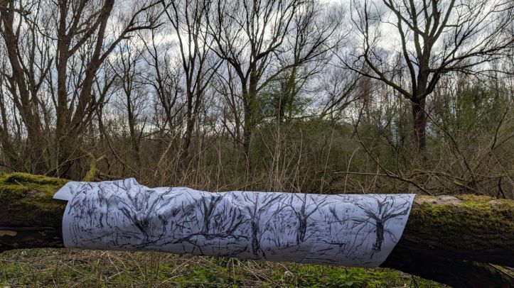Meander/ caught in the trees – Drawing whist walking, interventions, March 2025