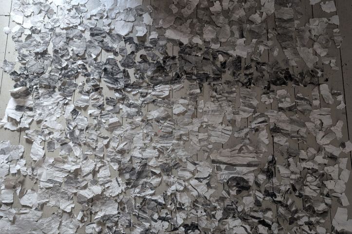An installation incorporating all 642 pieces of a drawing that was created live on Ballygally beach whilst on holiday. The original drawing captured the surrounding view of hills, sky, sea, stones, buildings and the beach.